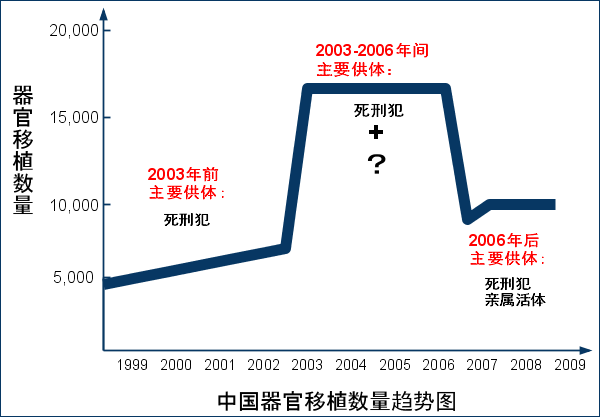 根据卫生部副部长黄洁夫和全军器官移植中心主任石炳毅提供的数据以及大陆媒体的各种报道,大致可以勾画出来中国器官移植数量的趋势图,如下所示: (详细情况和来源请参见附录5)
