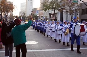 法轮功美西天国乐团应邀参加了假日大游行。身着中国古装汉服的天国乐团受到观众的欢迎。