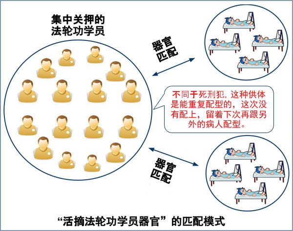 而被非法关押的法轮功学员与此不同。这次没有配上,留着,储备起来,下次再跟另外的病人配型,直到某一次被配上型为止,是“储备型资源”。大量法轮功学员又是集中关押的(这样的关押地在中国有多处),是“大样本资源”。这样,作为供体来源来说,供体数量和配型几率就大大增加。