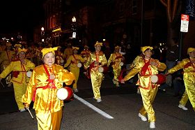 在队伍中,身着黄色传统服饰的法轮功学员腰鼓队特别引人注目,整齐、振奋人心的鼓声,伴随着“法轮大法好”的音乐,所到一处,喧闹的人群便安静下来,人们注视着这个充满中国特色的表演团体,眼神中充满了对东方文化的敬意。凝神片刻后,人群便传出阵阵喝彩声,并争相从学员们手中接过介绍法轮功的真相传单。