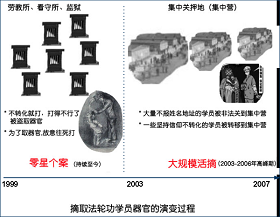 随后,“集中营”这个词开始在媒体上出现,用来描述那些用于非法关押大量法轮功学员的地方。