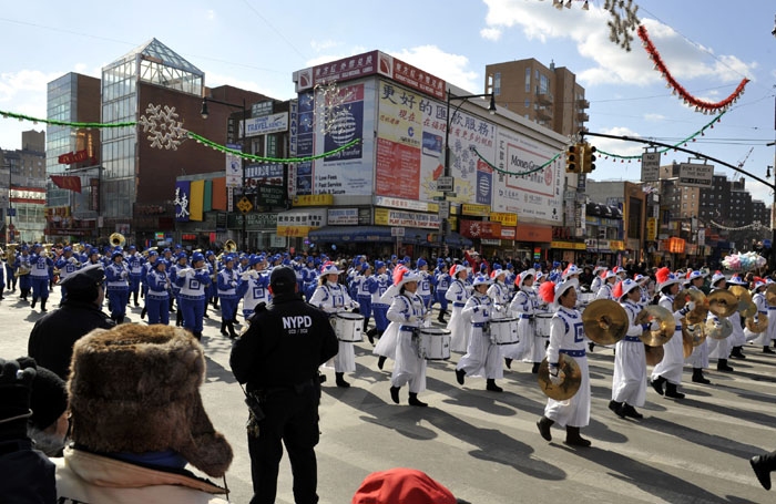 盛大的法轮功队伍感动了观众,人们纷纷照相,摄影,连警察似乎也舍不得法轮功队伍离开,引导着法轮功队伍在法拉盛最主要的华人街道上—缅街上多走了两条街的距离,一直表演。偌大的一条街上只有法轮功的队伍,绵延了整整一个大道的距离。