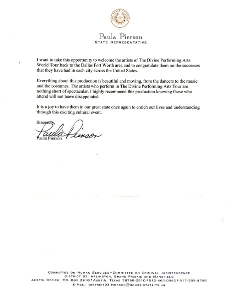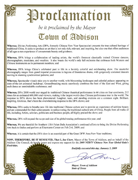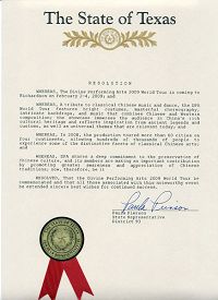 荣州市秘书处处长姜信镐表示:「在看神韵演出以前,我所了解的中国艺术仅限于去中国旅行时接触到的中国杂技团的表演,神韵艺术团使我对中华文化有了全新的认识、给予我珍贵的经历,在此表示由衷的谢意。」