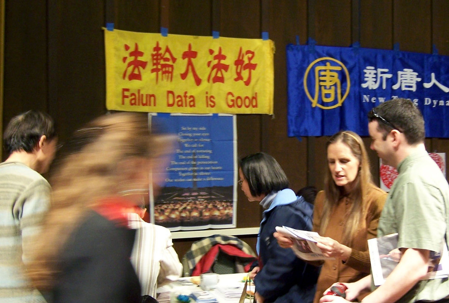 写有“法轮大法好”的横幅正对着商贸展厅的大门,人们一进来便可看到,显得格外醒目。横幅下面的展台上,资料丰富,内容详尽。法轮功学员将各种真相光盘、小册子、书签及精美的小莲花赠送给大家,人们欣然收下,连说谢谢!也有不少人驻足观看,并和法轮功学员坦诚交谈,表达了对法轮大法弟子坚持不懈讲真相的钦佩和赞叹,也更加理解了大陆大法弟子冒着生命危险传《九评共产党》的意义。一位大陆来的女士将剩下的四本《九评共产党》小型本都买了去,说准备带回大陆;一位基督徒说:“我虽然信仰跟你们不一样,但我相信你们说的,共产党气数尽了,善恶有报啊!”