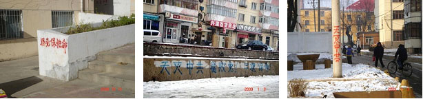 ![]() 二零零九年中国新年期间,北方某城市遍地出现“天灭中共”,“退党保命”等喷漆和条幅标语,震撼世人。 |