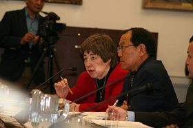 ![]() 应邀发言的芙丽斯•吉尔女士(红衣者)是联合国反酷刑委员会主席,也是美国国际信仰自由委员会主席。 |