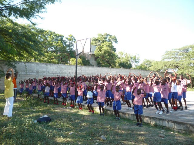 我们在海地建立了第一个炼功点:是星期六早上七点在le Croix des Bouquets市的一所中学内。