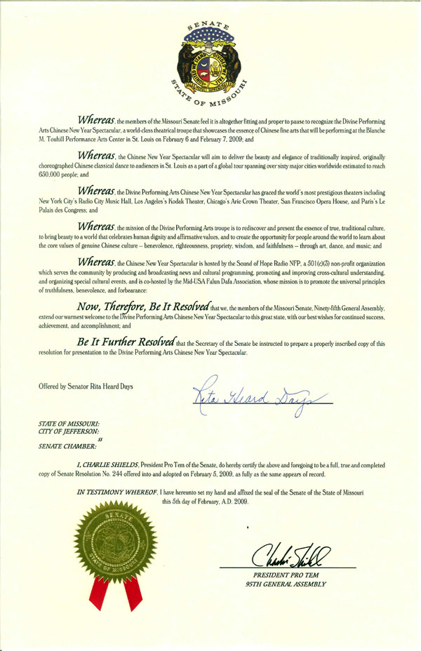 密苏里州参议院为圣路易二零零九年神韵新年晚会颁发的褒奖