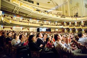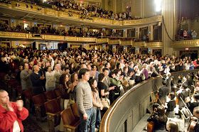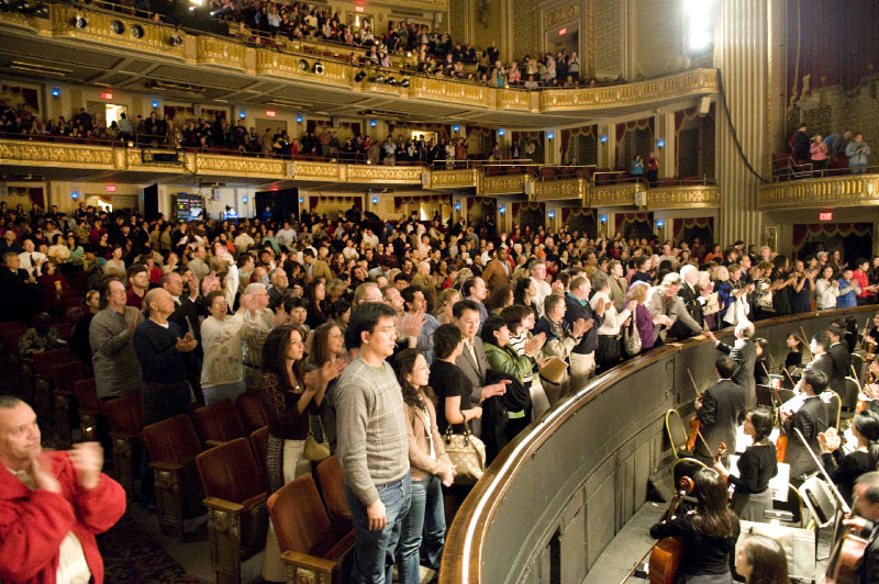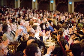 ![]() 神韵巡回艺术团在田纳西州孟菲斯市演出结束后,全场观众起立鼓掌,前排观众同乐队握手致意。 |