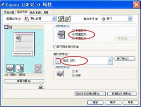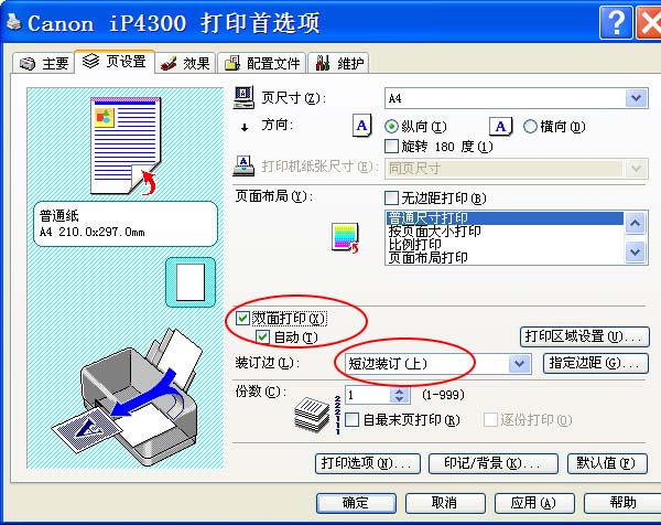 对于佳能机型的自动双面打印,要在打印机属性里选择“双面打印”和“短边装订”正反面才不会颠倒,彩喷和激光机都是这样设置的。