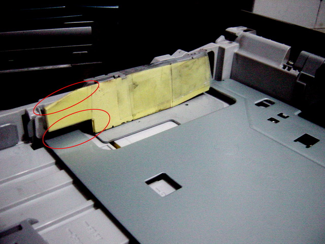 注意: 图中用红圈圈起来的两部份。上面要斜着剪一块,否则纸盒不能正常关闭。下面要剪掉一块,否则影响正常进纸。是用宽胶带或者冷裱膜固定的。
