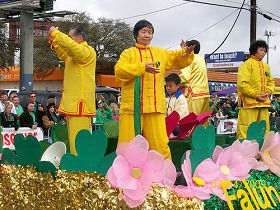 法轮功学员精心设计、装饰了与游行主题呼应的花车,“FALUN DAFA”、“法轮大法好”和大法网址的字样清晰醒目。五名身着金黄色炼功服的学员在花车上演示优美、祥和的五套功法。许多观众对他们报以热烈的掌声,还有人跟着学炼功的动作。
