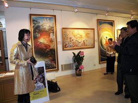 三月十四日上午,《真善忍国际美展》在台中县立文化中心开幕。文化中心主任纪镐雄(右二)与台中县清溪文艺学会理事长郭禹君(右一)在画家周怡秀导览解说后,给予画展热情的掌声。