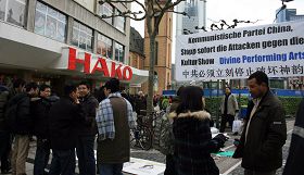 据法兰克福的法轮功学员熊女士告诉记者,当他们得知中共干扰神韵演出之后,他们开始组织法轮功学员到中领馆前抗议,那几天德国遇到多年不见的坏天气,先是气温骤降下大雪,然后遇到台风,狂风暴雪中法轮功学员没有动摇,他们坚持在中领馆门前,给过往的路人讲真相,并给被中领馆五次三番叫来的警察讲中共迫害法轮功、干扰神韵演出的真相。警察很感动,对法轮功学员表示,你们做的这一切都是合法合理的,我们出于工作,不得不来跟你们说中领馆的意思,但实际上你们只管继续坚持下去。