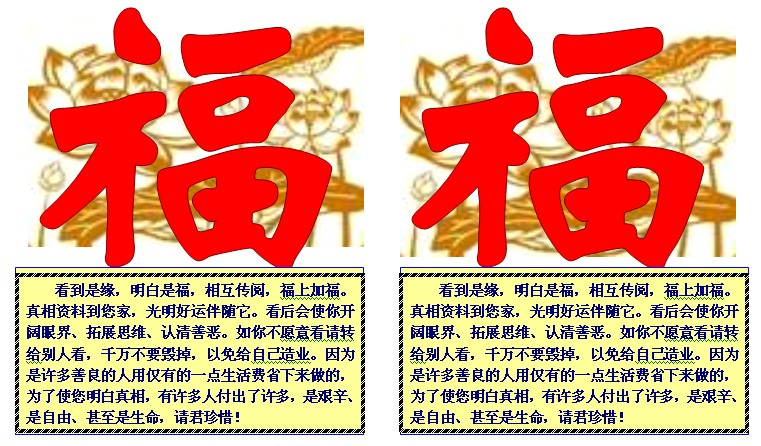 【明慧网二零零九年三月二十二日】发放真相资料用,打印时,打开打印属性,在颜色/浓度,点手动,浓度往暗的方向调到32,打印出来的福字鲜艳漂亮。如果同修嫌大,可以该为6版。