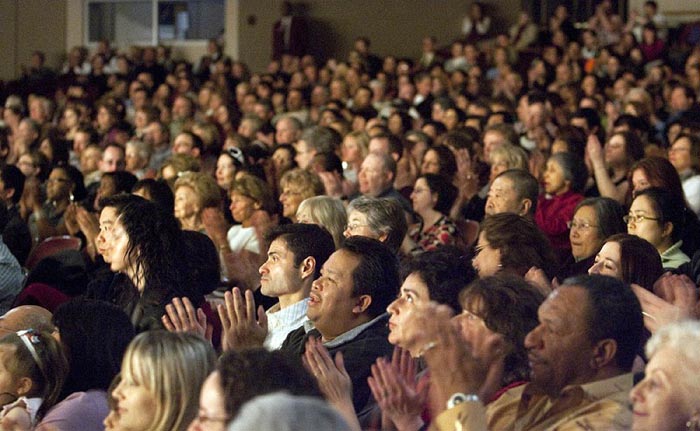 ![]() 神韵巡回艺术团在康州哈特福德市布什耐尔剧场演出,观众静心观赏 |