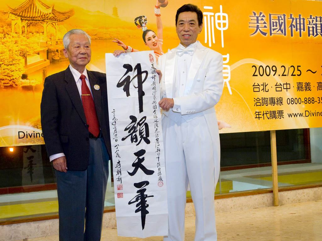 新竹压轴场有许多艺术家争相一睹神韵,其中享誉海峡两岸艺术界,八十八岁高龄的李干新因为观看神韵之后感动至深,决定将亲字书帖“神韵天华”四大字赠与神韵国际艺术团,由艺术团副团长关贵敏代表接受,关贵敏也于接受字书后,对台湾观众的热情表示感谢。