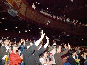 今年台湾许多政界、工商界、艺文界的精英,不仅自己慕名而来,还“组团”与亲友一同欣赏神韵。台北县五金界的“新海五金联谊会”与“融融会”,会员人数约六十人,今年将“观赏神韵”列为年度活动,加入亲友人数之后,组成一百七十人声势浩大的团体前来观看。散场之后,还轮流在神韵晚会巨幅海报前合影留念,引起旁人一阵关注。