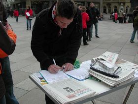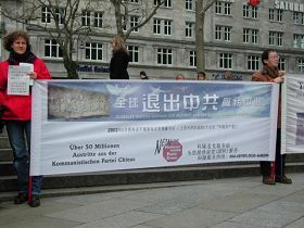 一周的阴雨连绵,在周五划上了一个句号,周六(二零零九年二月二十八日)德国科隆大教堂前又是人来人往,游客络绎不绝。来自科隆退党中心的义务工作人员和周边城市的一些支持者相聚在大教堂前,庆祝全球五千万民众“三退”(退党、退团、退队)的活动。
