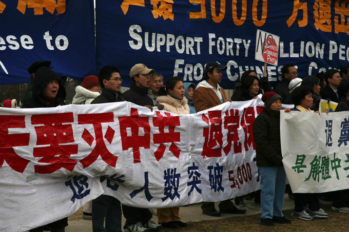 ![]() 2009年3月1日下午,美国首都华盛顿及周边地区的民众在国会山集会,声援五千万中国人退出中共党(团、队)。 |