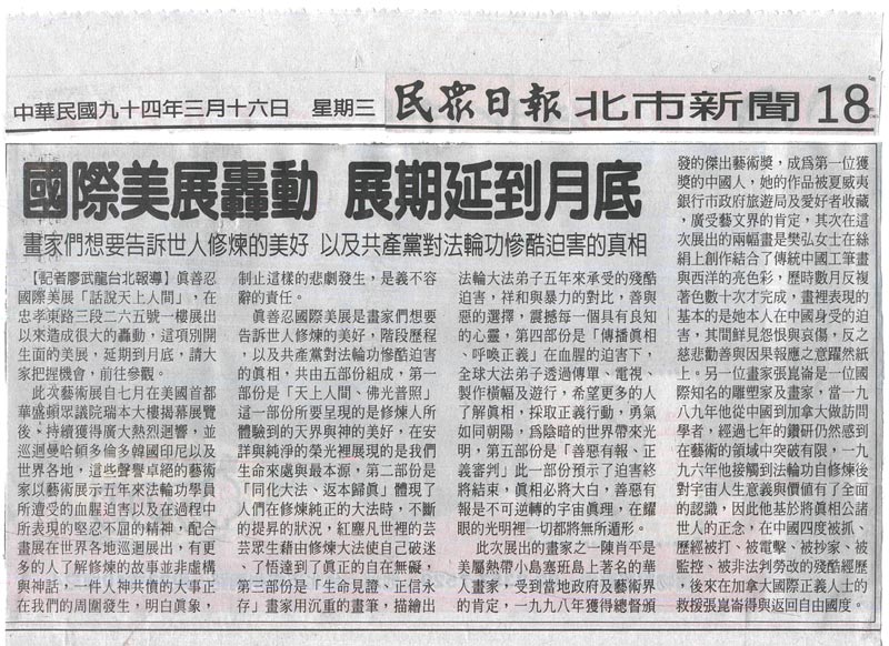 “真善忍国际美展”二零零五年二月二十五日在台北展出时引起很大轰动,原定三月八日结束的美展,延期到三月底。《民众日报》三月十六日以“国际美展轰动 展期延到月底”为题对美展做了报导。