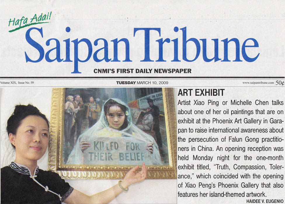 ![]() 二零零九年三月十日,美国“Saipan Tribune”(《塞班论坛报》)头版刊登了对美展和画家的介绍 |
