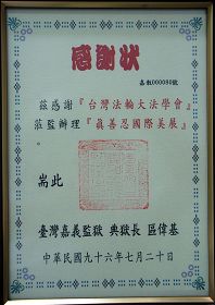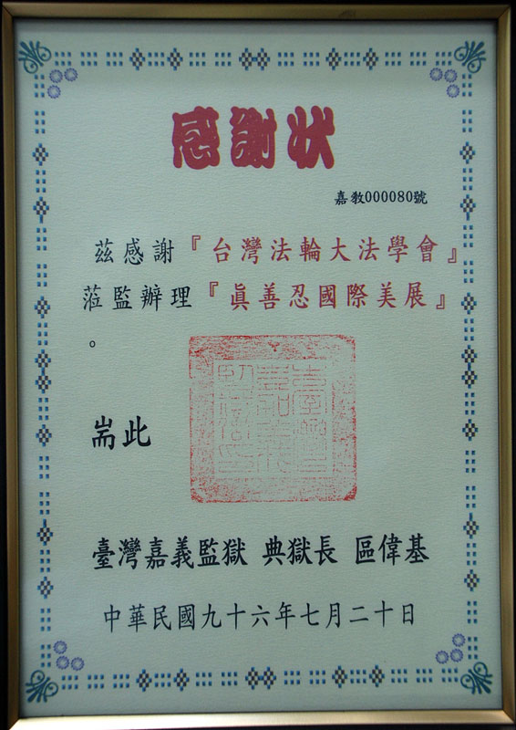 二零零七年七月十七日至二十日在嘉义监狱展出的“真善忍国际美展”,受刑人参观画展后,看到画作中,法轮功学员遭受迫害时,那种无怨而慈悲的表情,心里受到很大的震撼,感受到真善忍的高尚情操。展出结束时,监狱长并特别致赠“感谢状”,感谢台湾法轮大法学会为广传大法福音无私的付出。