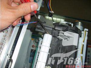 例二:下进纸搓纸轮在进纸构件里面很难操作,拆卸供纸单元也比较复杂。下面介绍不拆外壳和供纸单元也能容易的垫高搓纸轮的方法。这个方法和上面例一中介绍的区别在于要拆卸几个部件,让搓纸轮完全外露,使垫高搓纸轮操作更加容易。