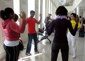 上午十点多,博览会还没有开始,法轮功学员正在布置展位,麻大的学生就驻足观看展板,并表示要学功。紧接着二个多小时,前来学功法的学生络绎不绝。其中欧马尔(Omar Khan.)和琳(Linh Tran)不仅将五套功法全部学完,还跟随下一批学功的学生再将五套功法复习了一遍后才离开。