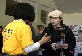 一位男学生以前曾参军六年,派驻海外,对亚洲文化有着浓厚的兴趣,能说一口流利的韩语。他说,他曾经在波士顿公园看到有人在炼法轮功,并从波士顿公园炼功点的展板上了解了中共迫害法轮功的真相。今天在自己就读的大学看到法轮功倍感亲切,表示要到附近的炼功点学功。