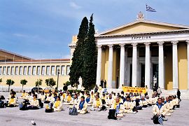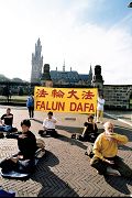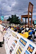台湾学员李秋英女士也谈到她去欧洲十二国的洪法之旅,“二零零一年十月二十三日早上在西班牙马德里市炼功洪法。我手中举着‘法轮大法在西班牙’的横幅,站在广场上,心中盼着善良的人们快点来了解真相!下午举行游行,队伍壮观肃穆,所到之处吸引了不少路人,商家,连楼上的人都出来看。有一位女士对着每一位被中共迫害致死的学员照片,不断地画十字,并且哭红了眼。更有一位女士追着横幅、照片,一一地看,并且念念有词,最后忍不住抓着一位举着大横幅的外国学员询问详情。看到她那激动的表情,令人感慨。大量的真相资料也被送到路人手上。”