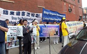 二零零八年携全家逃出中共监控来美,曾遭受北京团河劳教所残酷迫害并被非法劳教的前清华大学土木工程系副教授須寅先生第一个在集会上发言。