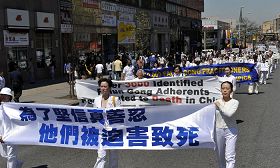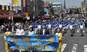 游行以天国乐团开路,分为三个部份:大法洪传,中原蒙难,众生觉醒。星期六的法拉盛,缅街(华人街)上人声鼎沸。游行队伍经过时,人们纷纷驻足观看,并拍照留念。