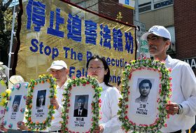 几十名法轮功学员身穿白衣,手持被迫害致死的法轮功学员的遗像,庄严肃穆的走在队伍中。被迫害致死的学员中,有记录的就超过三千多人,其中有年过七旬的老人,有年富力强的壮士,有青春年少的学子。之后是迫害图片,记录着中共邪灵的酷刑和屠杀。
