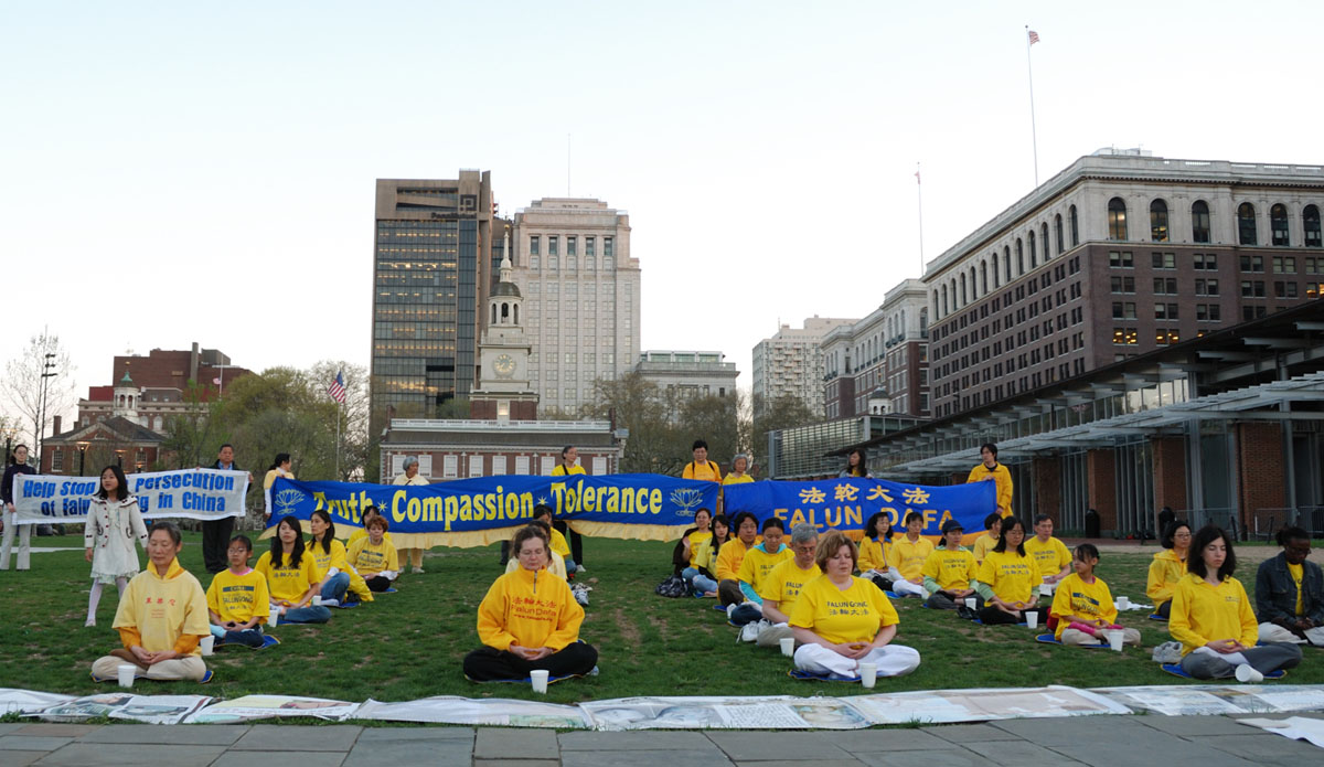 ![]() 法轮功学员在自由钟前,举行烛光守夜纪念“四·二五”十周年。过往游客纷纷停步了解真相,并签名呼吁中共停止迫害法轮功。 |