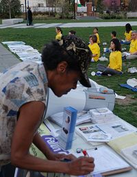![]() 白微丽•乔丹(Beverly Jordan)在共同制止迫害签名板上签名。 |