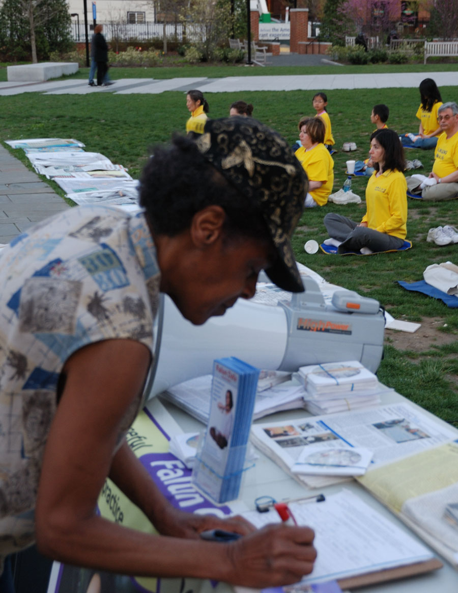 大费城地区当年亲身参加“四·二五”和平请愿的法轮功学员亲自讲述了自己的亲身体会,令很多行人止步聆听,并纷纷的签名支持法轮功学员的反迫害,获得自由。