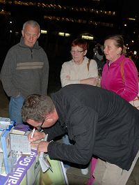 三十位从波兰来的游客参观完自由钟径直走过来询问,他们很多人不懂英文,当其中一个翻译告诉他们真相后,他们对法轮功被中共迫害表示非常同情,纷纷签名反对中共迫害法轮功,因为他们知道共产党的邪恶。