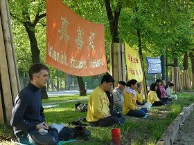 一对骑自行车路过的德国夫妇,特意下车,走到横幅前观看,当得知,修炼法轮功的人们在中国遭受迫害时,他们立即表示同情,并了解共产极权对人的信仰和传统文化的压制。