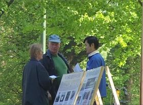 ![]() 一对骑自行车路过的德国夫妇停下来听法轮功学员讲真相。 |