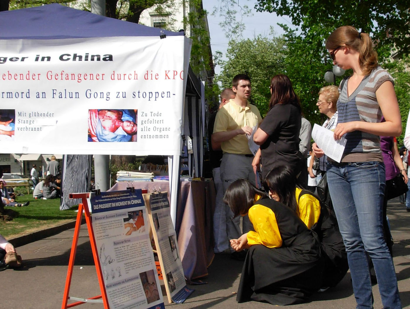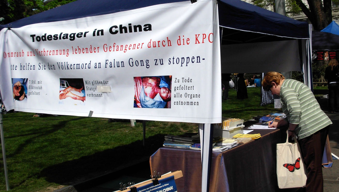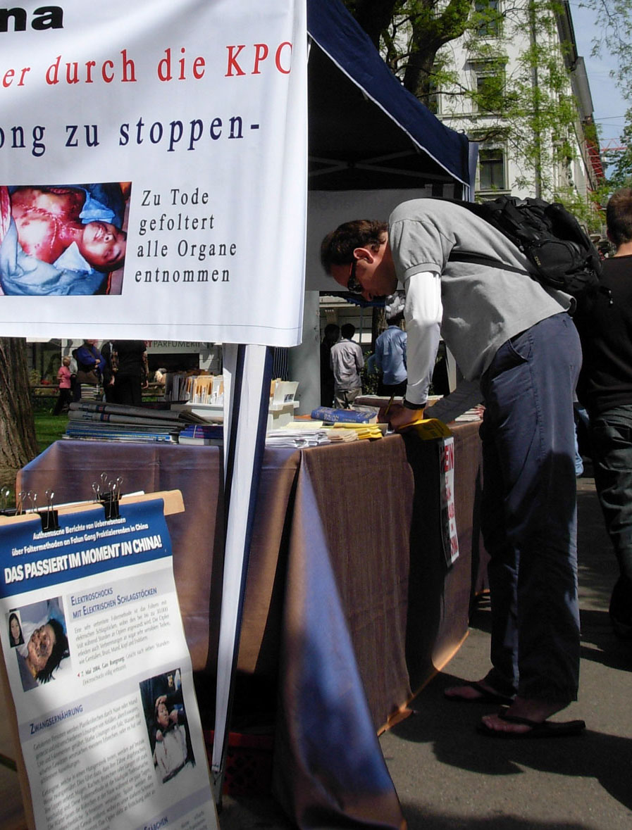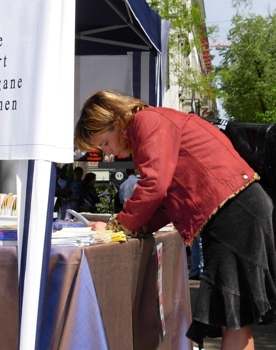 一位女孩听说有要求立即停止迫害的征签,当即折回签名,还说,必须马上签上五个名。有的人静静的看完展板后,主动要求签名,他们问:“有征签吗?”