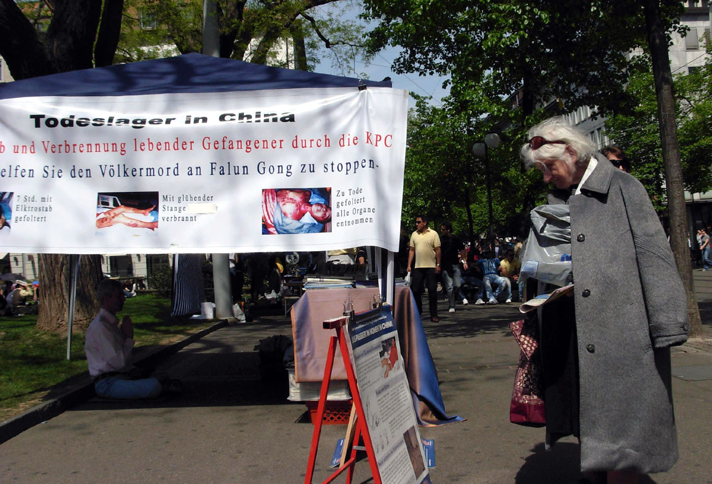 横幅上法轮功学员受迫害后的照片让很多人停下了脚步,有的仔细的阅读着展板上的说明,有的则和法轮功学员交谈,他们想知道为什么照片上的人会如此的伤痕累累。现场的法轮功学员向他们解释:“这些都是法轮功学员,仅仅因为他们想按照‘真、善、忍’做个好人,遭到中共血腥的迫害。因为中共想通过谎言和暴力控制所有的人,甚至是他们的思想,所以他们不允许人们信仰‘真、善、忍’,从而开始了对法轮功学员迫害,持续已经快十年了。”