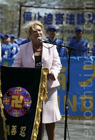![]() 纽约纪念4.25十周年,法拉盛社区领袖玛塔在集会上发言。 |