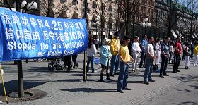 ![]() 2009年4月24日,数百名法轮功学员及支持者在多伦多中领事馆前集会,纪念“四·二五”十周年。 |