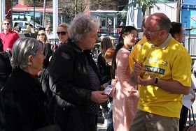 来自福州的高铭女士在布碌伦做收银员,第一次看到法轮功学员游行的她,不时的拿起相机为游行队伍拍照。她是在二零零一年首次听说法轮功的,那是从电视上看到“天安门自焚”,她说:“我并不相信。后来我在街上看到过一些法轮功学员,他们的表现,怎么可能会干那样的事?” 她表示现在越来越了解法轮功。
