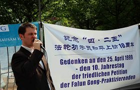 路人屏息静气。“今天是“四•二五”法轮功学员和平上访十周年纪念日。我们要告诉大家的是,十年来,中共对法轮功的迫害从未停止过,而且更加手段隐晦更加邪恶,它就发生今天的中国……”