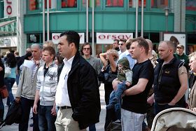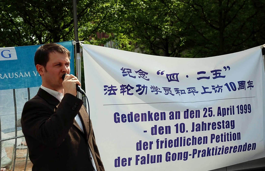 另一位看上去穿着非常体面的德国年轻人在匆匆经过时对发传单的学员说:“我在法轮功这件事情上花了很多功夫(去研究)。我觉得法轮功学员非常勇敢。”