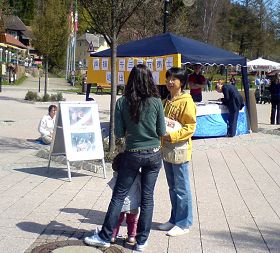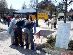 一位在此定居的大陆女士,指着“声援5千3百万勇士退出中共!”的横幅说,自己在欧洲定居了,和共产党没关系了,已经远离中共了,不用退了。经学员讲真相后她明白了,最后请学员给自己起了一个吉利好听的名字,高高兴兴做了“三退”。