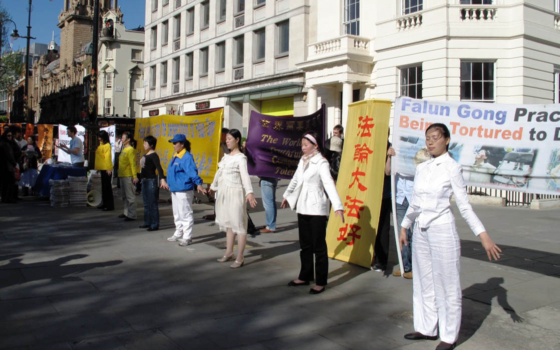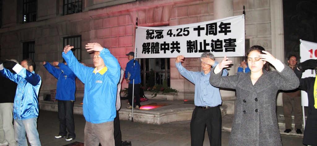 法轮功学员在伦敦中使馆前的集体炼功与和平抗议
