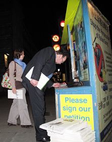 夜色中,法轮功学员在祥和的炼功音乐中打坐炼功,在一旁,两位印巴裔年轻人悄然站在真相展板前凝神观看,其中布拉迪• 沙伊(Bradid Shah)先生是从事环境科学研究的,图萨•辛格(Tushar Singh)辛格先生是位商业分析师,他们今天偶然经过这里发现了法轮功真相。沙伊先生说:“我祝福法轮功,我认为争取基本人权是正义的,我相信法轮功必胜。”辛格先生是个金融分析师,他有些激动的告诉记者:“我支持法轮功学员,反对迫害,维护人权是世界上任何政府起码该做到的,法轮功看起来是平和的,不妨碍任何人,他们在加强提升自己的身体和精神,从而有助于世界和平,当然应该允许他们这样做。我当然要支持法轮功。”